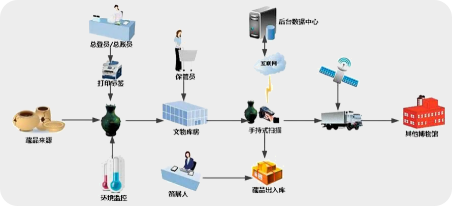 利用RFID、二維碼、條形碼、雙向數(shù)據(jù)通信技術(shù),結(jié)合藏品全流程管理業(yè)務(wù),實(shí)現(xiàn)藏品實(shí)體及其信息的遠(yuǎn)程、非接觸式、一體化管理。